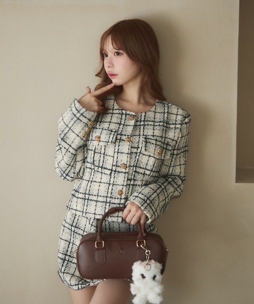 高級感漂うツイード素材に、ゴールドボタンが映える上品なチェック柄セットアップです。