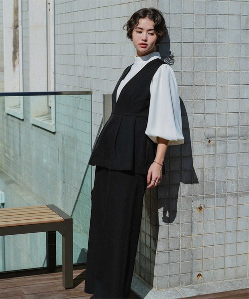 ペプラムトップスとパンツが一体になった、1枚でコーデが完成する上品オールインワン。