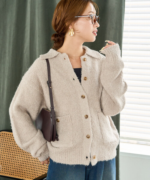 クラシカルなポロ襟と女っぽなブークレが融合したニットカーディガン