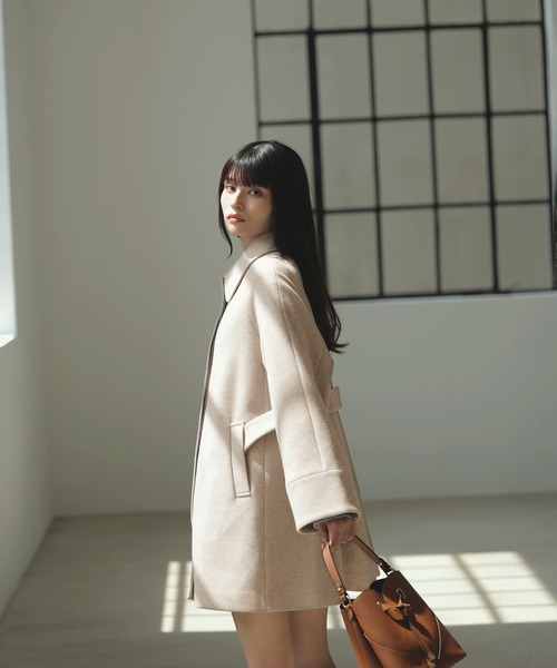 Aラインのシルエットを生かして、ミニボトムと合わせてコートメインのスタイリングがおすすめ。