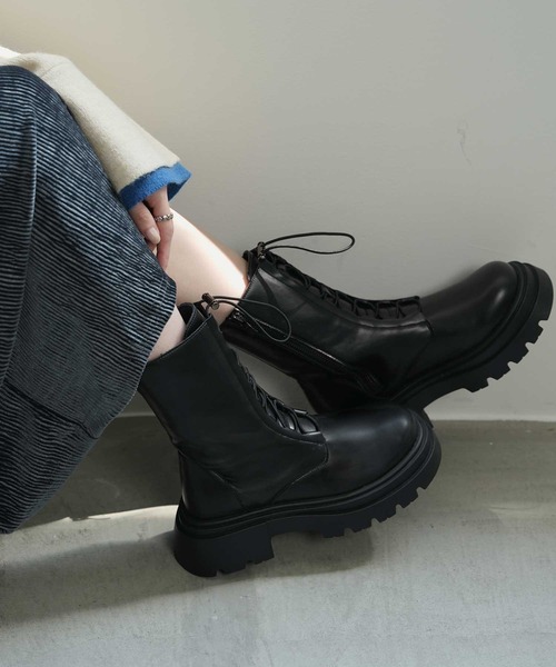モードに映える、ドロストデザイン レースアップブーツ艶感のある合皮素材を使用した、ミドル丈のドロストブーツ。