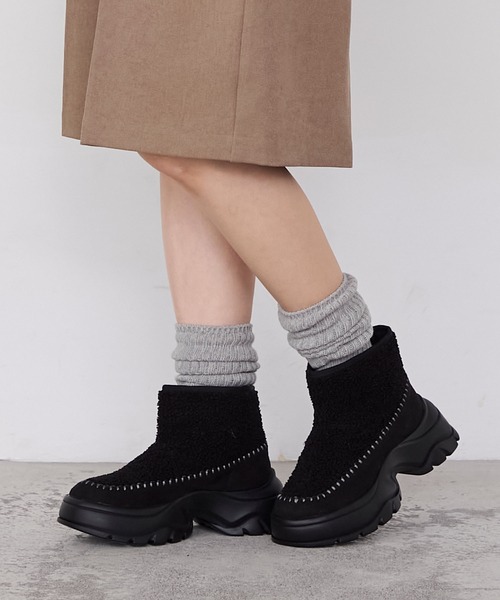 もこもこのボアとスウェード調の異素材を組み合わせた、季節感あふれるショートブーツ。