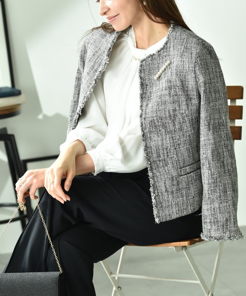 高級感あるツィード素材が魅力ノーカラージャケット