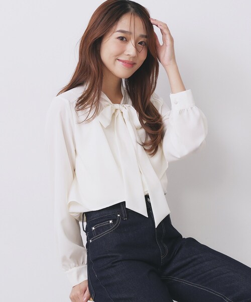 ・ボウタイが首元を華やかに彩り、フェミニンさと知的な印象を両立。
