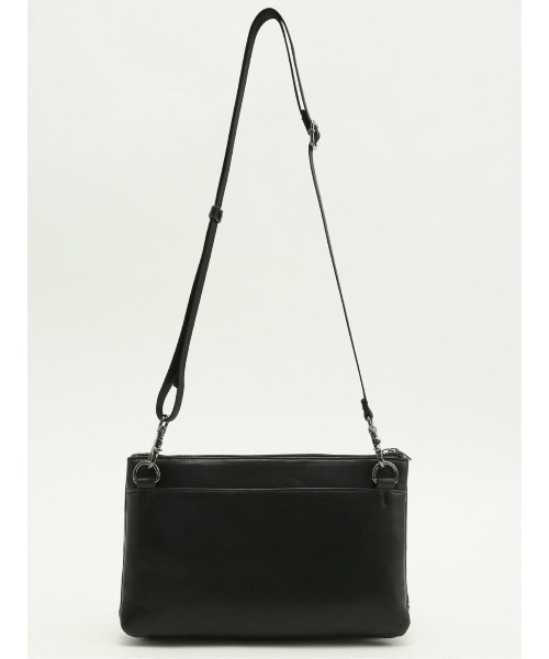 二層式のクラッチバックです。デザイン性の高いダブルジッパーと異素材で切り替えたデザインがポイント。付属のベルトを使えば、ショルダーバッグとしても使える2WAY仕様。ストラップを取り付ける背面のD管はクラッチとして持つ際に邪魔にならないように、外側から見えない位置に配置しています。