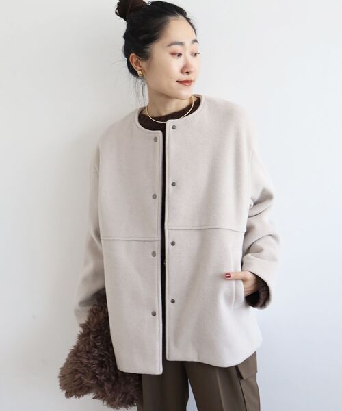 ノーカラーデザインなのでタートルネックやハイネックのアイテムと好相性。
