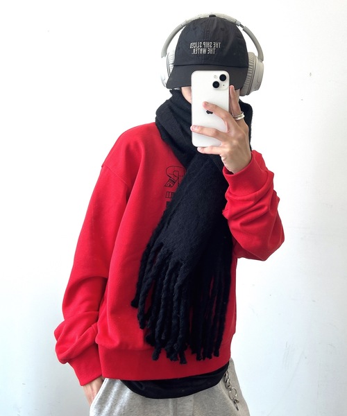 たっぷりとしたボリューム感が魅力のフリンジ付き大判マフラー。