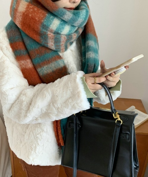 チェスターコート×デニムにざっくり巻いて、暖かさと可愛さを両立。大判サイズで制服の上からも羽織りやすい。