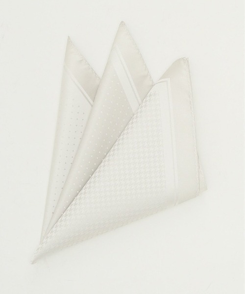 4種類の柄を1枚に表現した、四面切り替えのパネルデザインです。胸ポケットに挿すだけで胸元にボリュームが出て、一気に華やかな印象になります。挿し方のアレンジも多彩で、ジャケットスタイルのアクセントとして活躍してくれます。結婚式や披露宴、パーティーシーンのドレスアップに1枚持っていると重宝します。