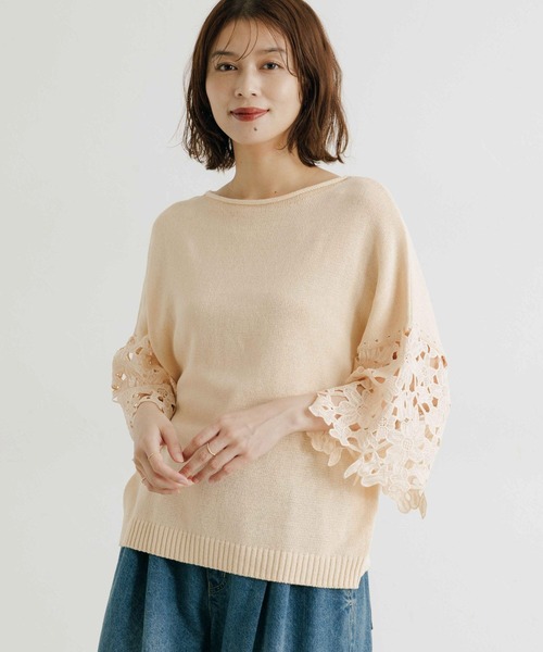 身頃はニット素材を使用していますが、袖レースの透け感もあり晩夏でまだ厚さが残る時期もご着用いただけます。