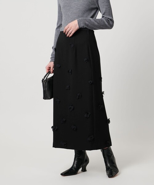 軽く柔らかい印象の立体的なフラワーモチーフが施されたタイトスカート。
