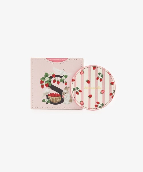 ケースには大きな「S」のイニシャルにうさぎや鳥、いちごのアートをちりばめ、ミラー裏面にはいちごとストライプの総柄を施しました。存在感のあるデザインなのでバッグの中でも見つけやすく、スリムで軽量なため、ポーチの中にもすっきり納まるのが魅力。ご自分用にはもちろん、ちょっとしたギフトとしても喜ばれるアイテムです。