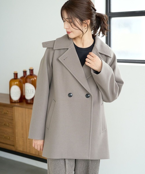 ベーシックなPコートを軽い素材で仕上げ、着心地がよくデイリーに着こなせるアイテム。チンタブがついているのでスタンドカラーとしても着用可能。