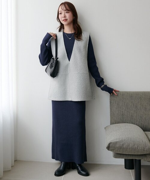 ・ベストを脱いでニット+スカートでシンプルなワンピース風の着こなしに。