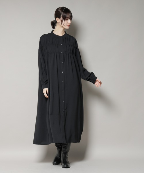 フロントに入ったギャザーデザインが、顔周りを華やかな印象にしてくれるデザインワンピース。体型カバーが叶うリラックス感あるシルエットで、一枚ではもちろん、前釦を開けてパンツを合わせたりと幅広いスタイリングを楽しめる一着です。