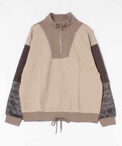2色のニットソー生地をベースに、両袖にふくれジャカードと裏起毛の幾何学柄プリント生地を組み合わせたハーフジッププルオーバー。