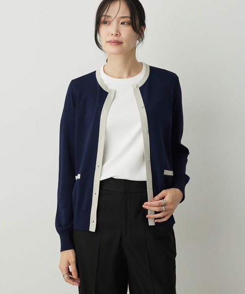 配色切り替えのデザインがクラシカルで上品な印象を与えるカーディガン。