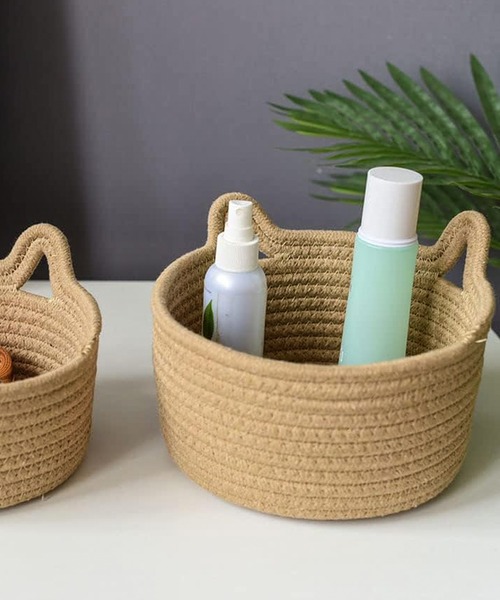 洗面所では毎日使うスキンケア用品やヘアオイル、コットン類をひとまとめに。狭いスペースでもスッと収まり、猫耳の取っ手があることで取り出しも楽々です。コスメをおしゃれに見せる収納としても使えるので、美容好きな方には特におすすめ。リビングでは、リモコンやティッシュ、スマホの充電器など、つい散らかりがちな小物類をすっきり収納。猫耳のシルエットが可愛いアクセントになり、ただの収納では終わらない、見せるインテリアとしても映えます。ソファ横やサイドテーブルの上にもぴったりです。また、子供部屋ではヘアアクセサリーやおもちゃ、小さな絵本の収納に。やわらかいコットンロープ素材なのでお子様が使っても安心で、お片付けの習慣づけにも◎。見た目が可愛いので、お子さん自身が楽しく整理整頓できるようになります。玄関に置けば、マスクや除菌スプレー、鍵など「毎日使うけど置き場所に困るアイテム」をきれいにまとめることができます。お客様の目に触れる場所でも猫耳デザインが好印象を与え、センスの良さを感じさせます。