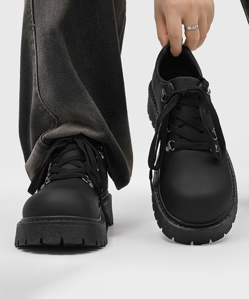 タフなデザインと都会的な雰囲気を兼ね備えた厚底レースアップシューズ。無骨なマウンテンブーツを思わせるメタルフック仕様とラギッドソールが男らしい存在感を放ち、スタイリングにエッジを効かせます。アッパーはオールブラックで統一し、スラックスと合わせればモードな印象に、カーゴパンツやデニムと合わせればストリートやミリタリーMIXに。厚底仕様ながら軽量設計で歩きやすく、フェスや旅行、アウトドアイベントでも活躍。シンプルながらもトレンド感あるシルエットは、Y2Kや韓国ストリートを取り入れたい男性にも最適です。ワイドパンツに合わせれば存在感抜群のボリューム感を演出でき、スキニーパンツに合わせれば足元をシャープに引き締めることも可能。自然なスタイルアップ効果もあり、スタイリングの幅を広げる万能アイテムとして手に入れておきたい一足です。