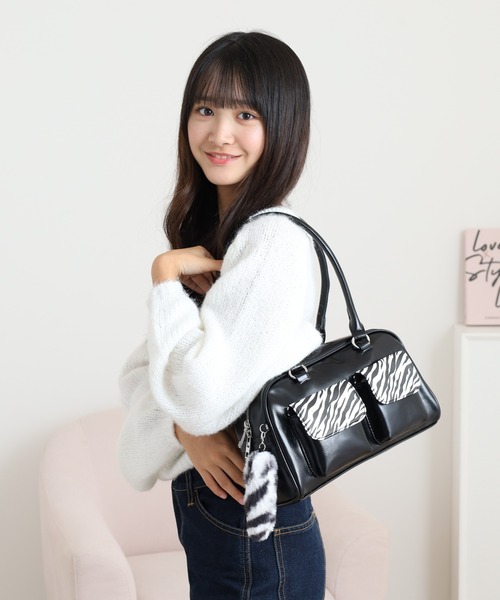 ゼブラ柄のクリアポケットが目を引くボストンバッグです。