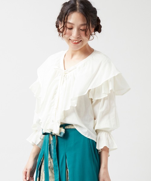 ボリュームのある付け襟と、袖のフリルがコーディネートのポイントに。