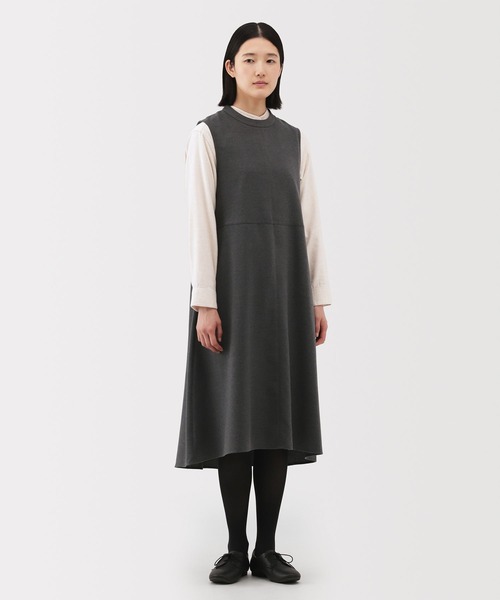 ゆったりとしたAラインのシルエットが特長のジャンパースカートです。前中心とウエストに切り替えを入れることで、縦長のシルエットに見えるようデザインされています。裾は後ろ下がりで、着用時にフレア感がきれいに出るように仕立てました。