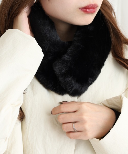 ふんわりフェイクファーが首元を包むマグネット留めの上品ティペット