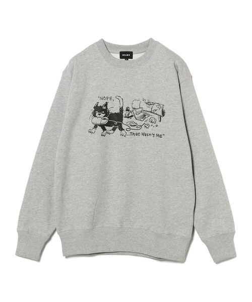 ”私じゃないよ!”というメッセージがプリントされた、ユニークなネコのグラフィックを施したクルーネックスウェット。