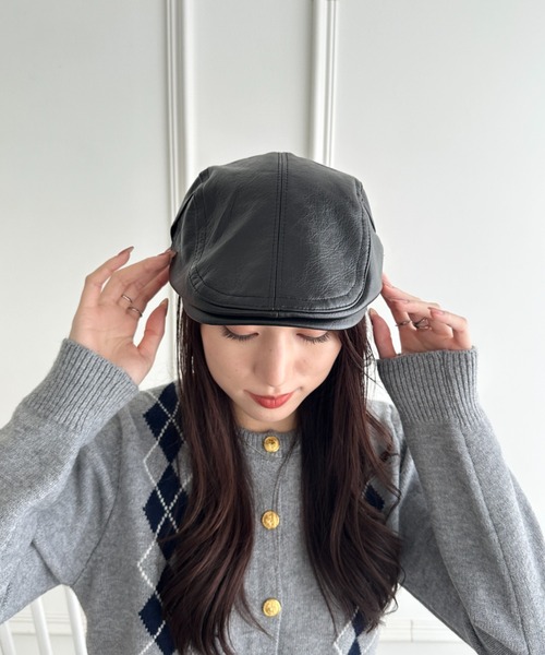 滑らかな合成皮革が上品な雰囲気を演出するハンチング帽。
