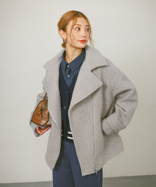 ミドル丈のライダース型で、裾にタックを入れバックシルエットに丸みを持たせたシルエットがこだわり。