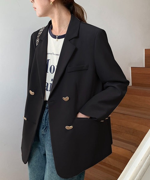 【こなれ感のあるカジュアルブレザー】テーラードのきちんと感に、ゆったりシルエットで抜け感をプラスしたカジュアルブレザー。フロントにはユニークなボタンをあしらい、シンプルながらも個性を感じさせるデザインに仕上げています。羽織るだけでスタイリングを格上げしてくれる万能アイテムです。
