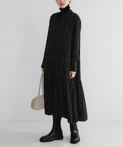 裾に向かってふんわりと広がるティアードシルエットが華やかさを演出します。一枚でさらりと着るだけで様になるデザインで、パンプスやブーツを合わせるとシックな着こなしに。パンツをレイヤードして着たりカジュアルダウンするのもおすすめです。