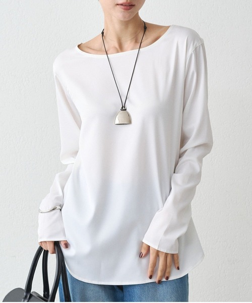 上品なボートネックが鎖骨を美しく見せ、顔周りをすっきりとシャープな印象に。