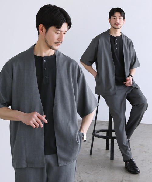 参考商品名:【上下2点セット】 接触冷感テックリネンノーカラー半袖カーデ or オープンカラー半袖シャツ &テーパードパンツセットアップ