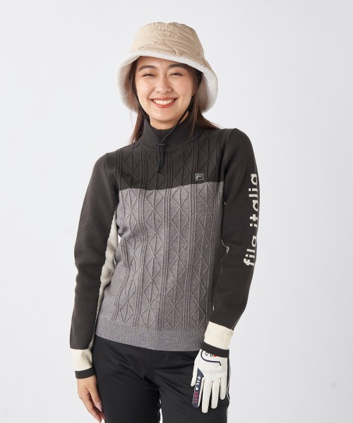 軽量で肌触りの良い4者混ニット素材を使用したモックネックセーター。FILAらしいブロック切替デザインがスタイリングのアクセントに。