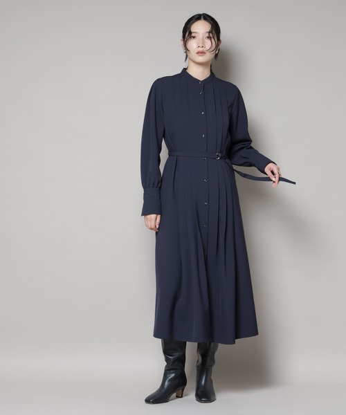 ロングシーズン着やすいきれいめで肉厚なポリエステルダブルクロス素材で仕立てたロングワンピース。フロントに並んだタックはウエスト付近まで中縫いを入れすっきり綺麗に見えるシルエットに。付属のベルトをウエストマークでスタイルアップした女性らしい着こなしから、ベルトを外してモダンな印象のスタイリングまで幅広く魅せれる一着です。