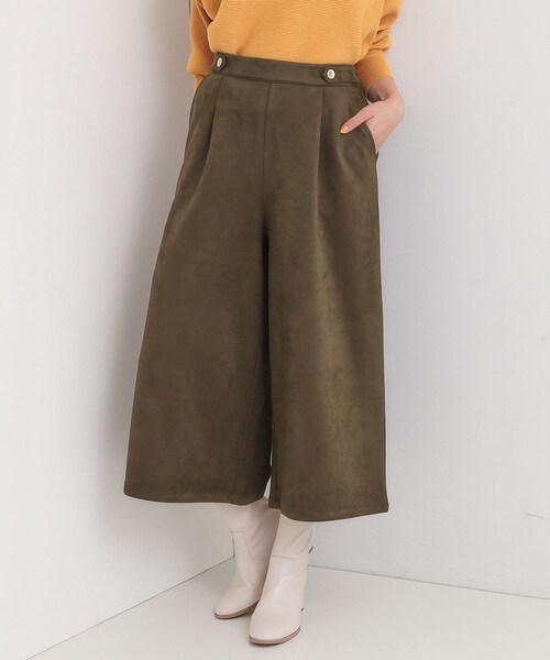 滑らかで柔らかいフェイクスエード素材のガウチョパンツで、ウエスト後ろ部分はゴム仕様になっており、リラクシーに着ていただけます。