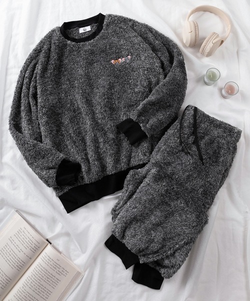 ■おすすめPointボアフリースの暖かい素材のセットアップ。ジェリー&タフィーのワンポイントデザインのシンプルな作り。サイズ感はレギュラーフィットで、オーバーサイズでゆったり目のコーデや、ジャストサイズでトップスをコンパクトにまとめてボトムをルーズに合わせる着こなしもおススメです。ちょっとしたお出掛け時のワンマイルウェアとしてやルームウェアとしてもおすすめです。