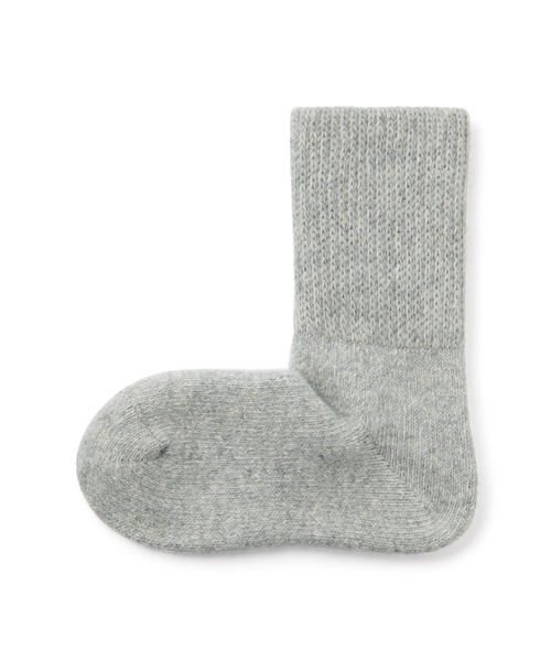 ウール素材を使った、肉厚のパイル編みにふっくらと編み立てました。履き口は、締め付け感の少ない仕様です。