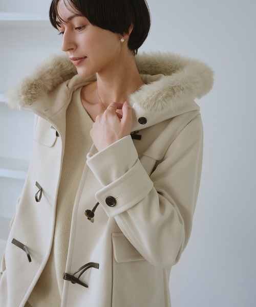 ・フードにたっぷりとファーを飾った、ショート丈のダッフルコート。