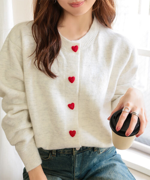 フロントのハートボタンがアクセントになった、大人可愛いニットカーディガン。