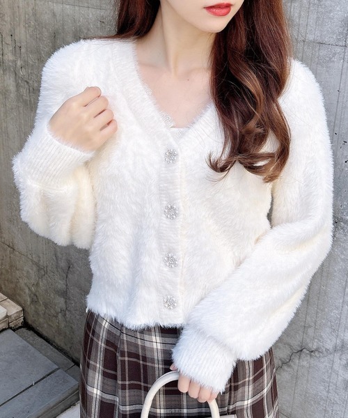 【広めに開いたVネックに繊細なレースをあしらったデザイン性のあるカーディガン】
