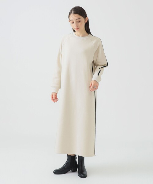 両脇とラグラン袖山の細巾ラインがデザインポイントのワンピース。シンプルながら着映えするストレートシルエットです。