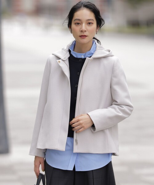 ・取り外し可能なフード付きのショートコートは後ろさがりのデザインで、厚手のニットなども着やすいように程よくゆとりをもたせています。