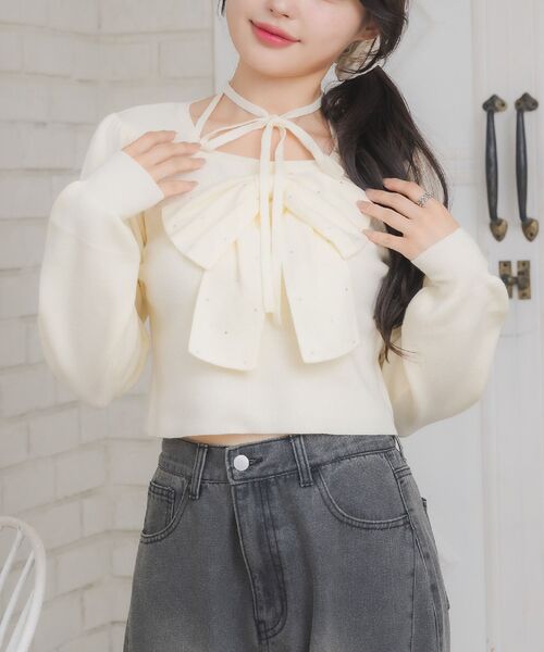 #フロントリボン #リボンアイテム #リボン #ガーリーコーデ #ガーリーアイテム #リボンニット #ビジュー