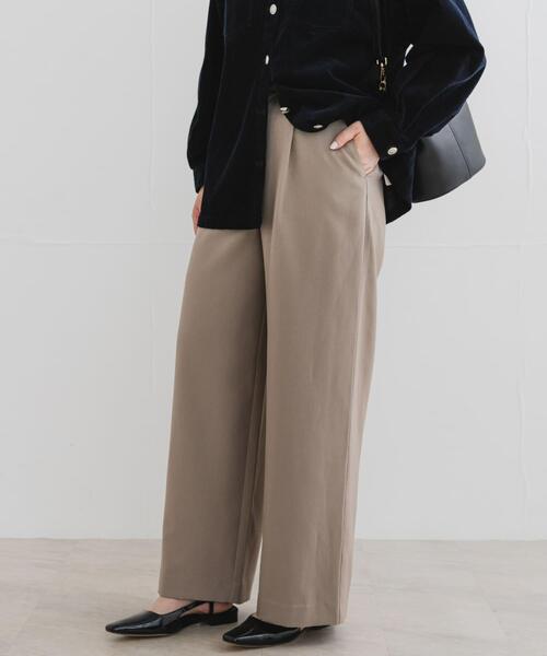 【広がりすぎない上品なシルエットが魅力の、タックワイドパンツ】ポリエステルベースの素材は、シワになりにくくお手入れが簡単。程よくストレッチが効いているので、ストレスフリーな履き心地です。秋冬のワードローブに欠かせない、着回し力の高い一本に。深めに入ったタックが腰回りをすっきりと見せ、脚のラインを拾わないワイドシルエットが、体型カバーも叶えます。ブラウスやニットをウエストインして着用すると、スタイルアップした着こなしが完成。オーバーサイズのトップスと合わせた、リラックス感のあるコーディネートもおすすめです◎