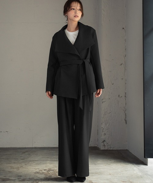ジャケットは大きめの襟が顔まわりを華やかに演出し、ベルトでウエストの調整が可能。