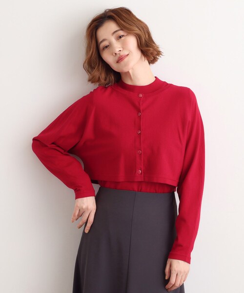 クロップド丈のドルマンカーディガンとハイネックニットのアンサンブルです。