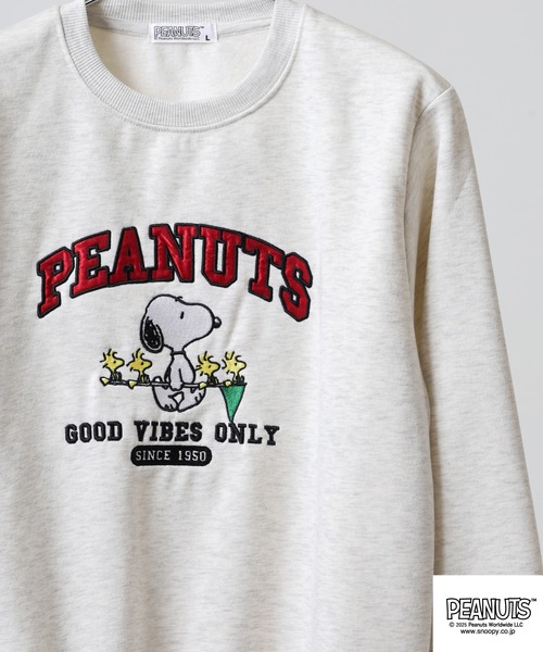 コミック「PEANUTS」に登場するスヌーピーとウッドストックのイラストとロゴの刺繍が映えるデザインの裏起毛トレーナー。