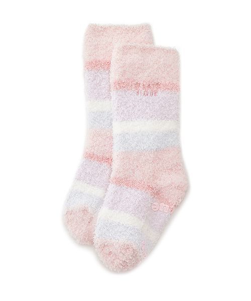 キャンディのようなカラフルなボーダー柄が幸せ気分を演出する、親子でお楽しみいただける’ベビモコ’シリーズです。足元に可愛いアクセントを添えてくれるKIDSサイズのルームソックス。足底に滑り止め付きで、サイドにワンポイントでロゴ刺繍も入っています。同シリーズのルームウェアや小物と合わせたり、BABYアイテムとのリンク・コーディネートも可能です。